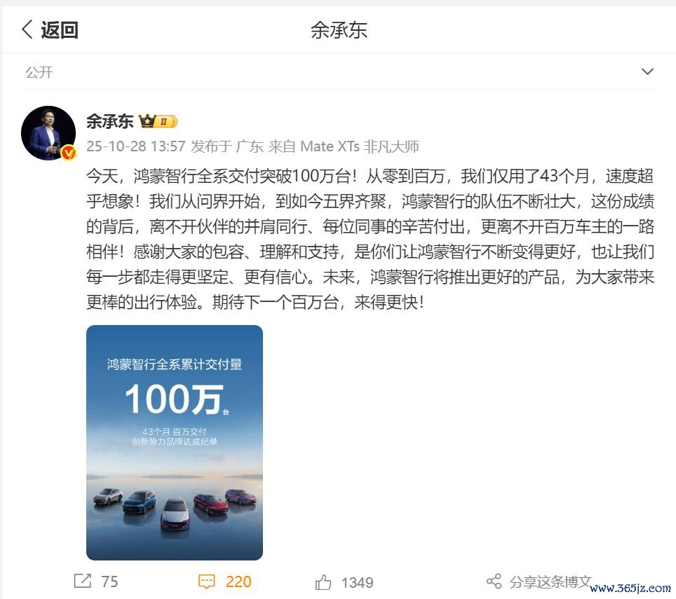 10月28日米牛配资,华为常务董事、产品投资委员会主任、终端BG董事长余承东发文称,今天,鸿蒙智行全系交付突破100万台,从零到百万,仅用了43个月。