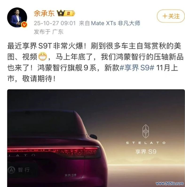 另据余承东微博10月27日发文称,鸿蒙智行旗舰9系,新款享界S9将于11月上市。