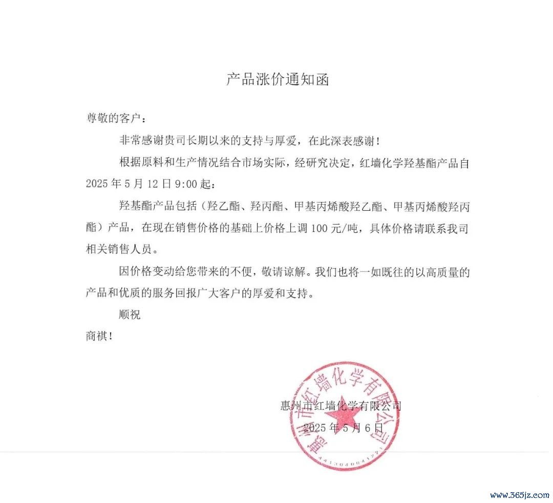 红墙股份发布羟基酯产品涨价通知函配资网红墙股份发布羟基酯产品涨价通知函