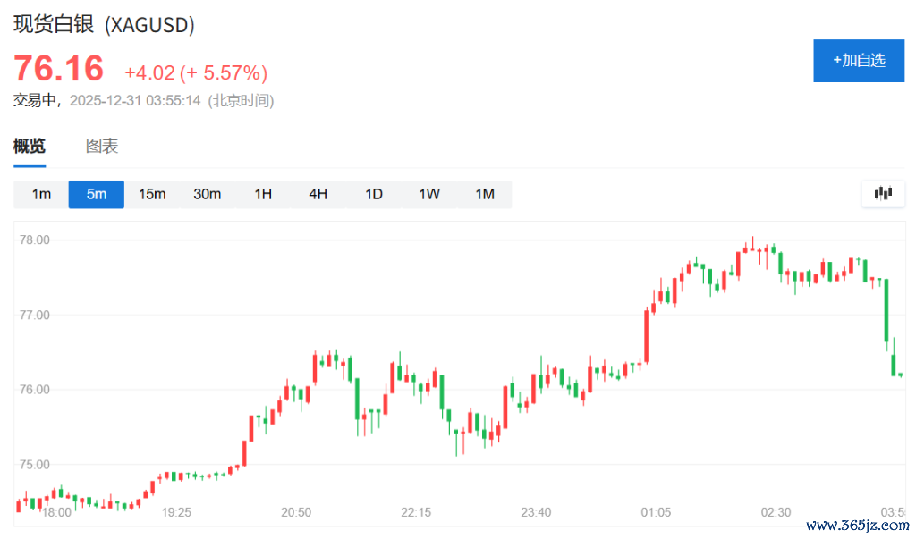 30日,现货白银涨近5.6%至76.16美元/盎司。此前一个交易日曾暴跌9%。这轮抛售发生在投机性交易和供应短缺担忧推动白银价格创历史性飙升之后。