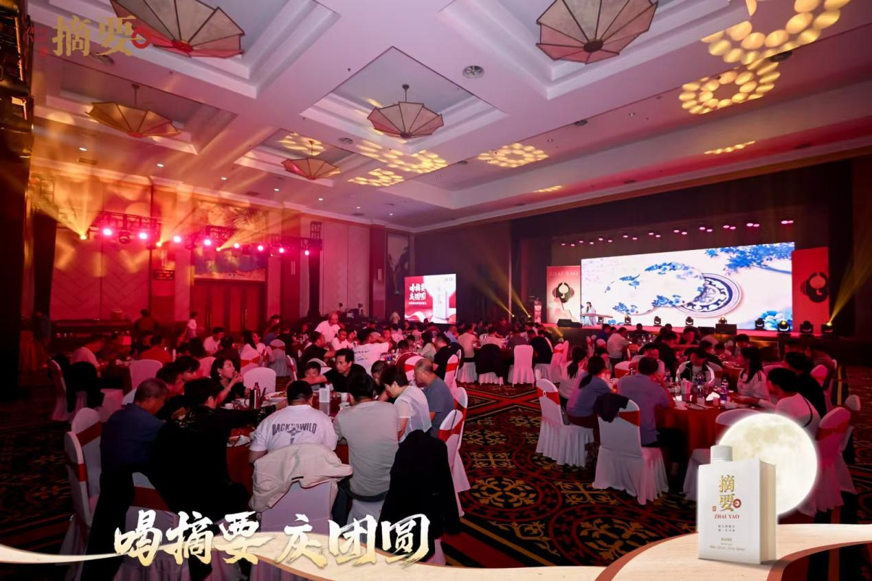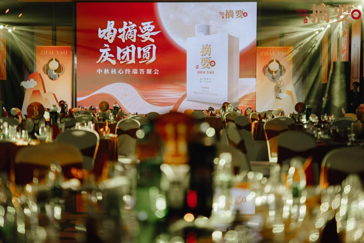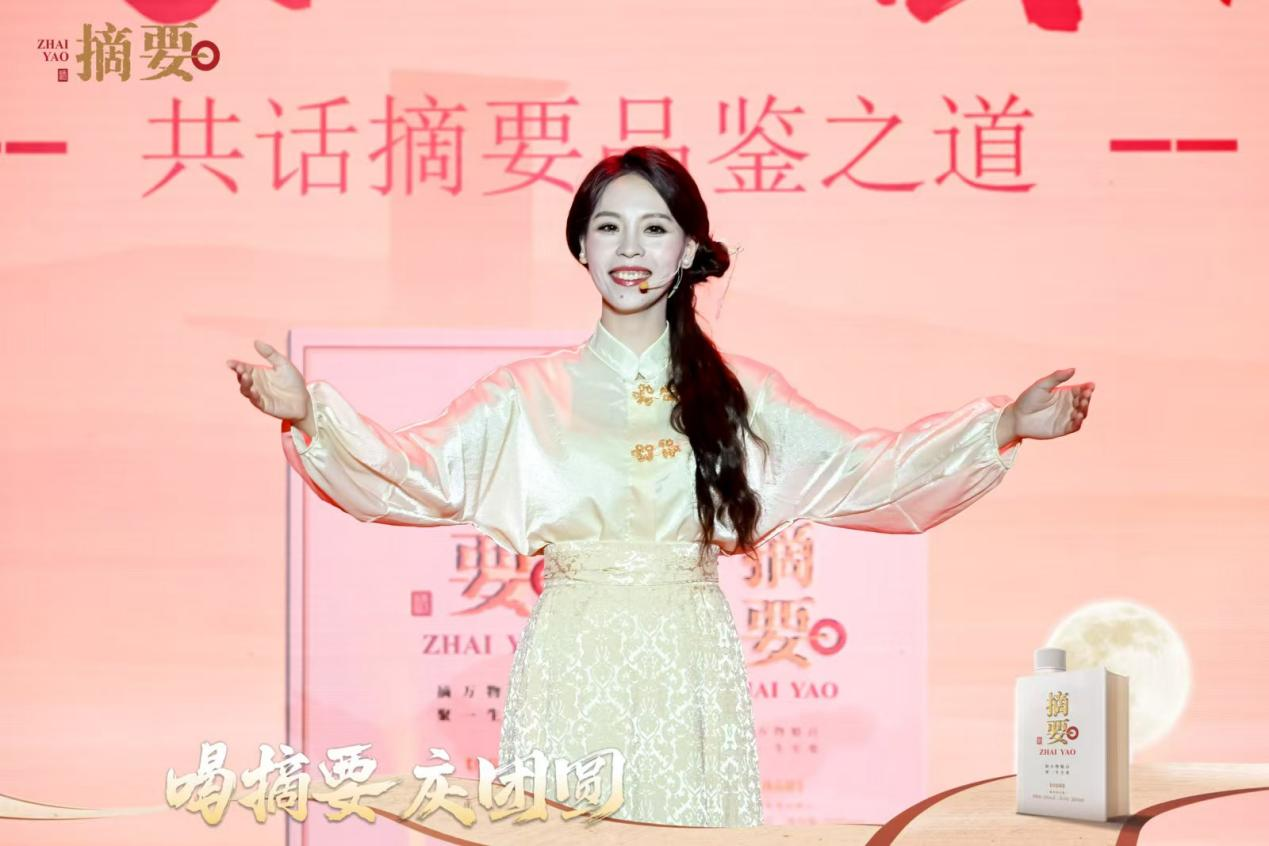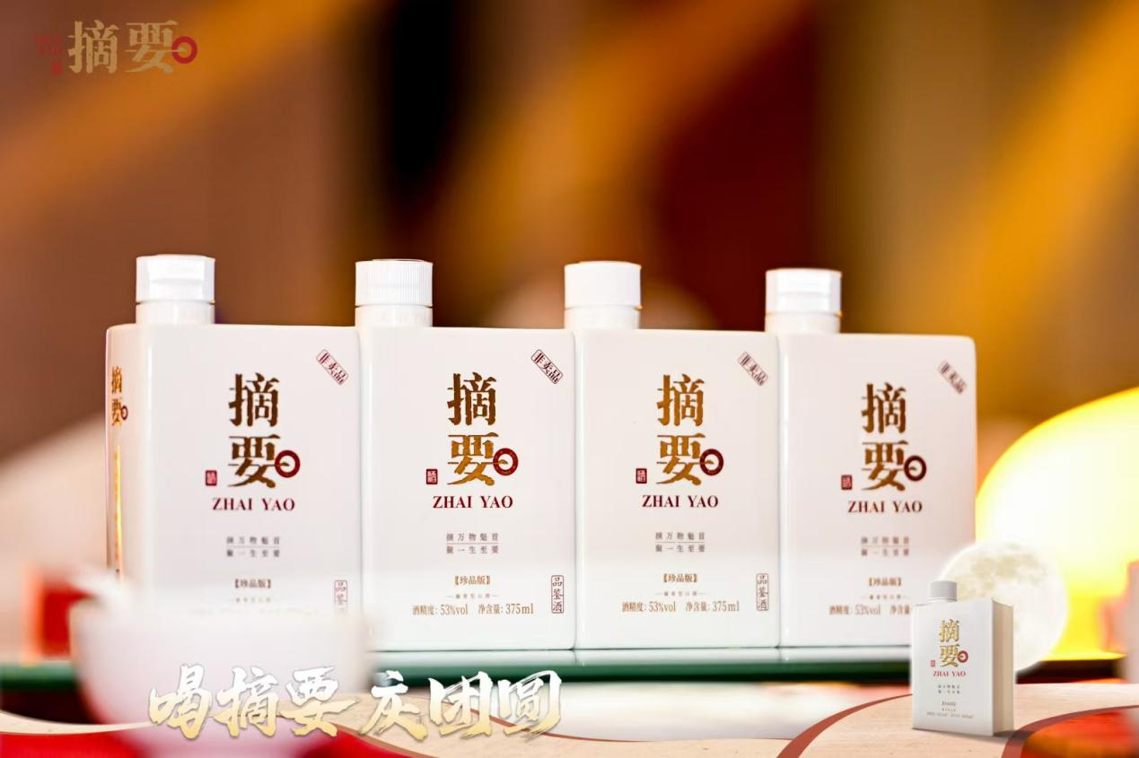 其品质之形,在于书酒合一的文化感。 摘要酒的瓶体设计,取意于一卷宏阔的典籍,温润的釉色与厚重的质感,静默诉说着“摘万物魁首,聚一生至要”的品牌箴言。它让美酒超越了饮品的范畴,成为一件可品读、可感悟的文化艺术品。在品销会的现场,当嘉宾们在品牌大使的引导下,举杯端详、闻香品味,完成的不仅是一次感官的愉悦之旅,更是一场与匠心和文化的精神对话。摘要酒的品质,于此情此景中,与中秋的圆满、文化的传承深刻绑定,烙印在消费者的记忆深处。